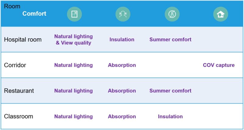Scenarios have been defined in each room to showcase the benefits of SG solutions for Visual Comfort, Acoustic Comfort, Thermal Comfort and Indoor Air Quality.